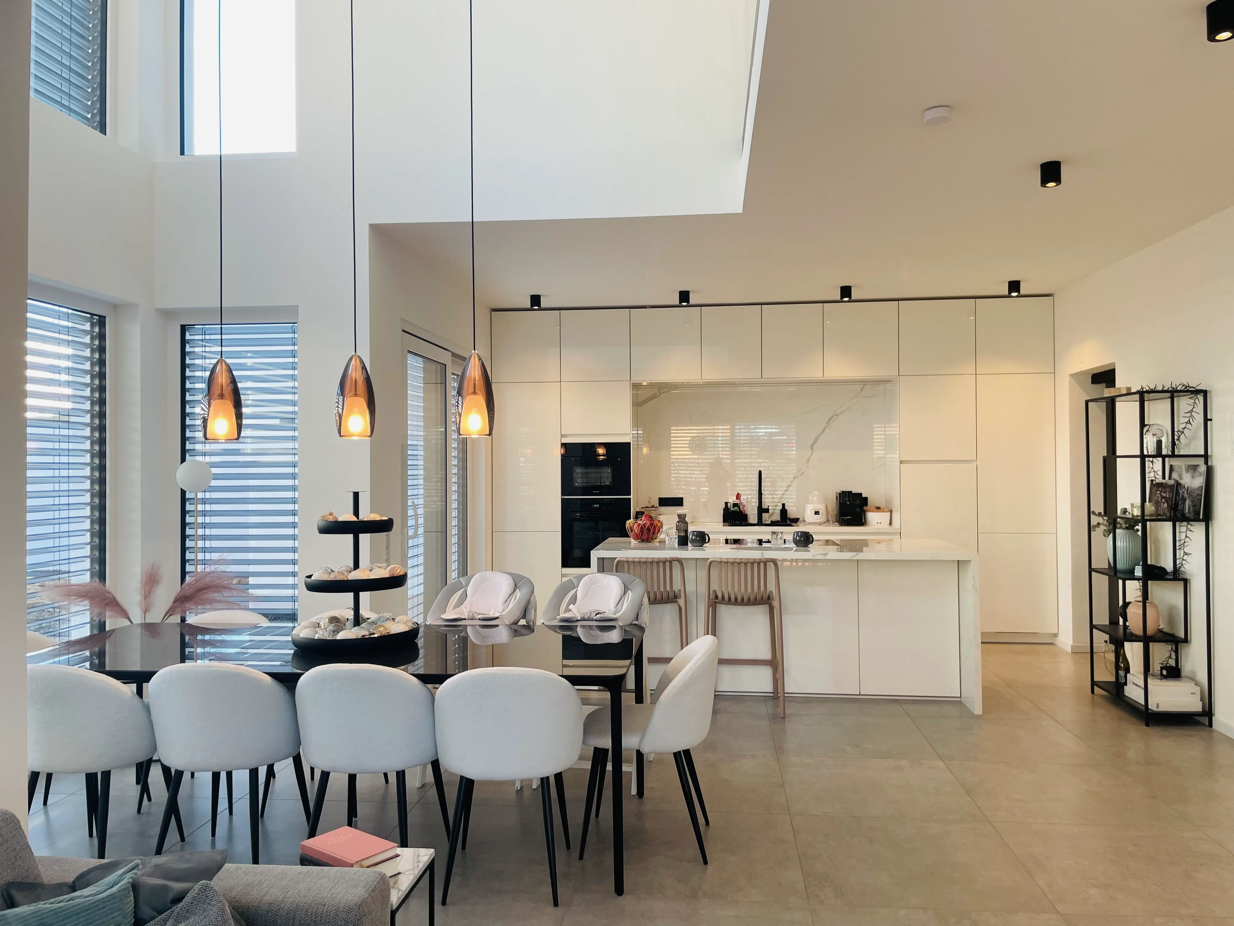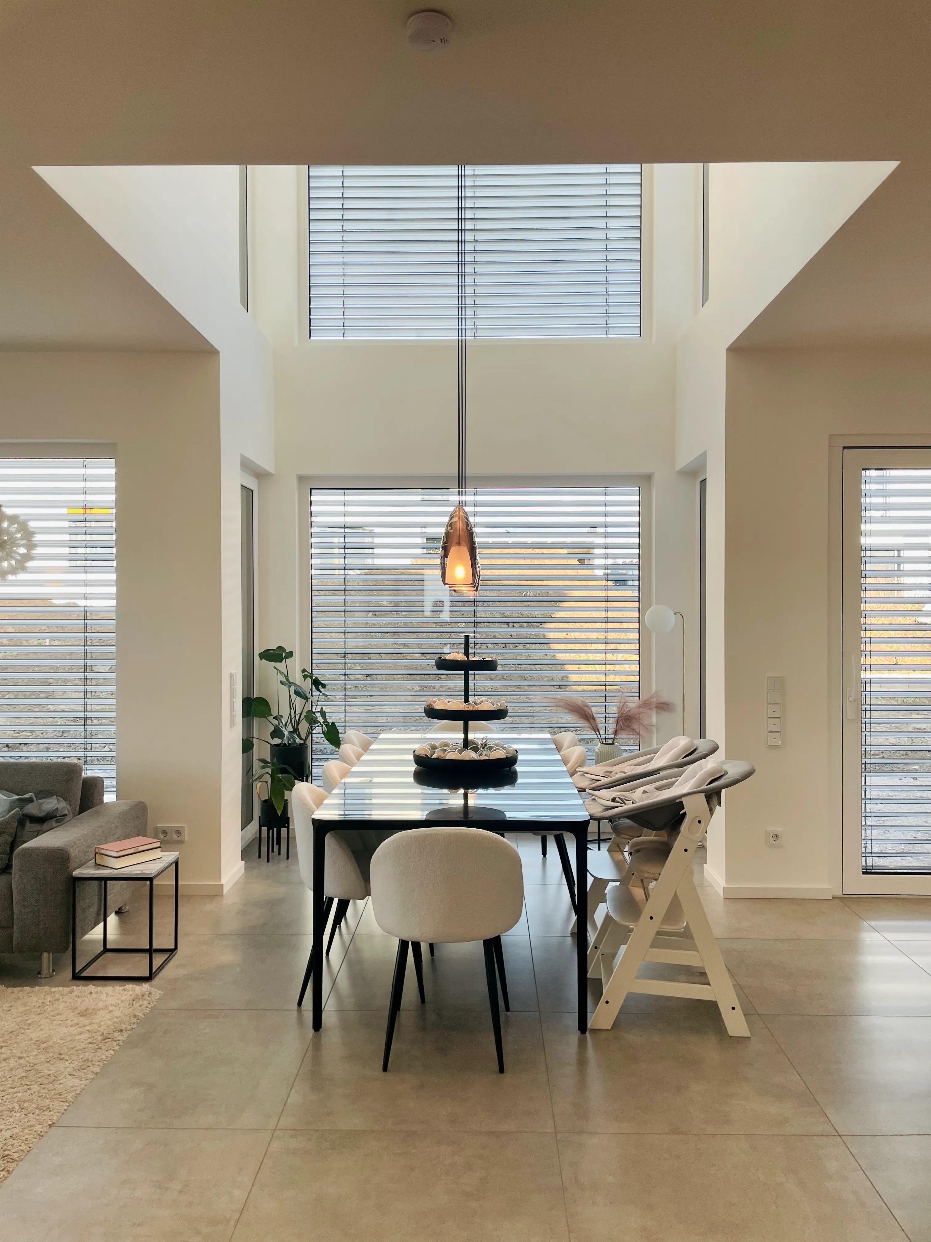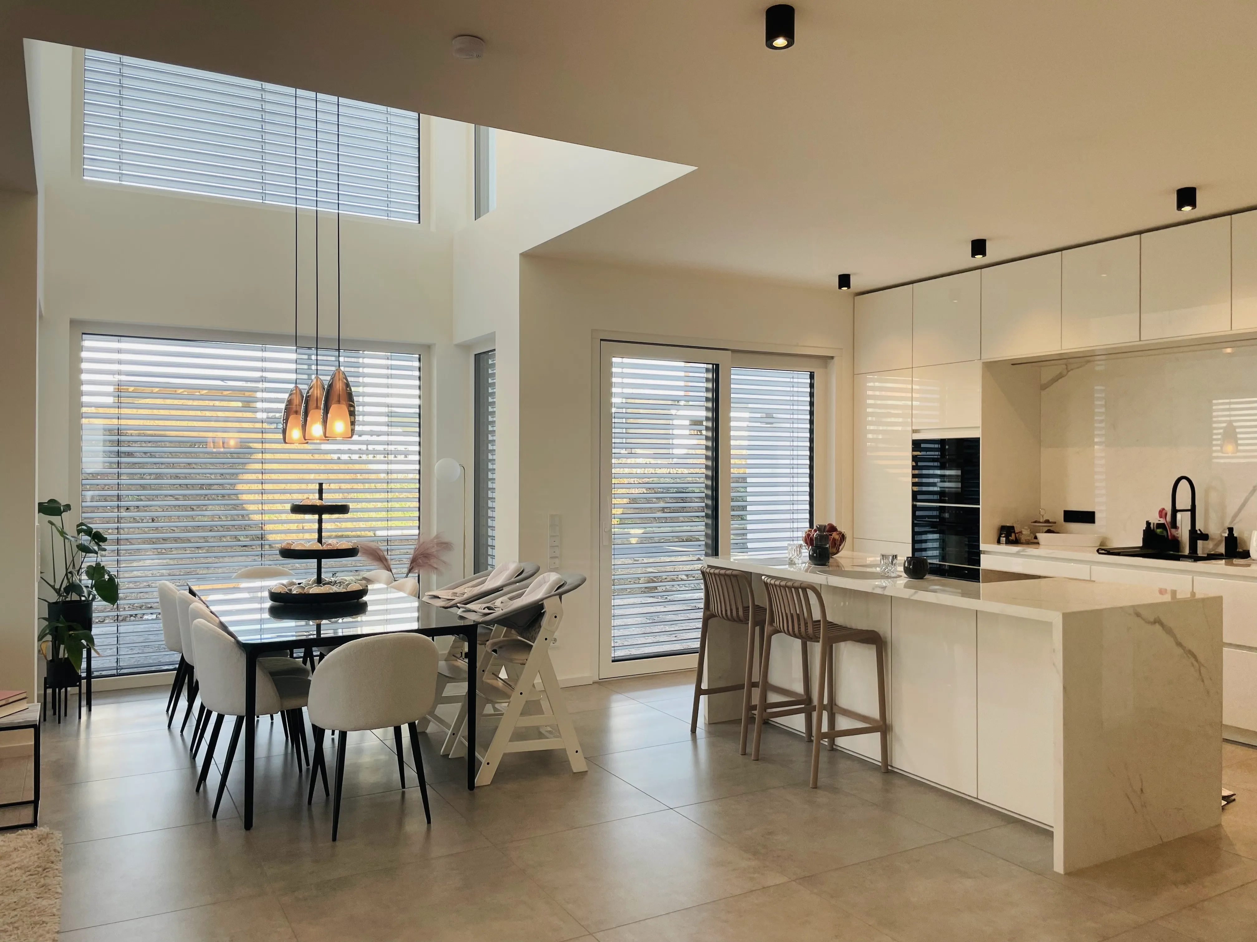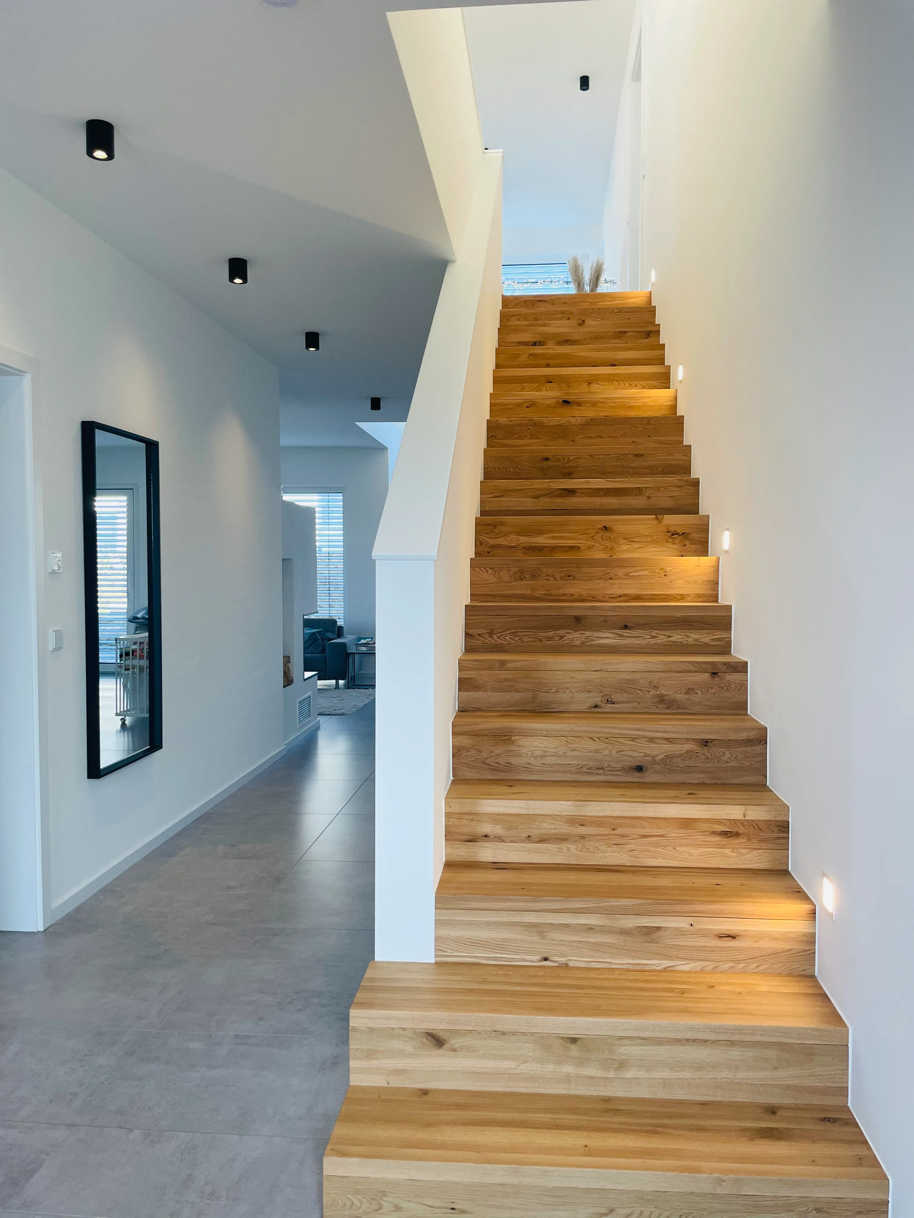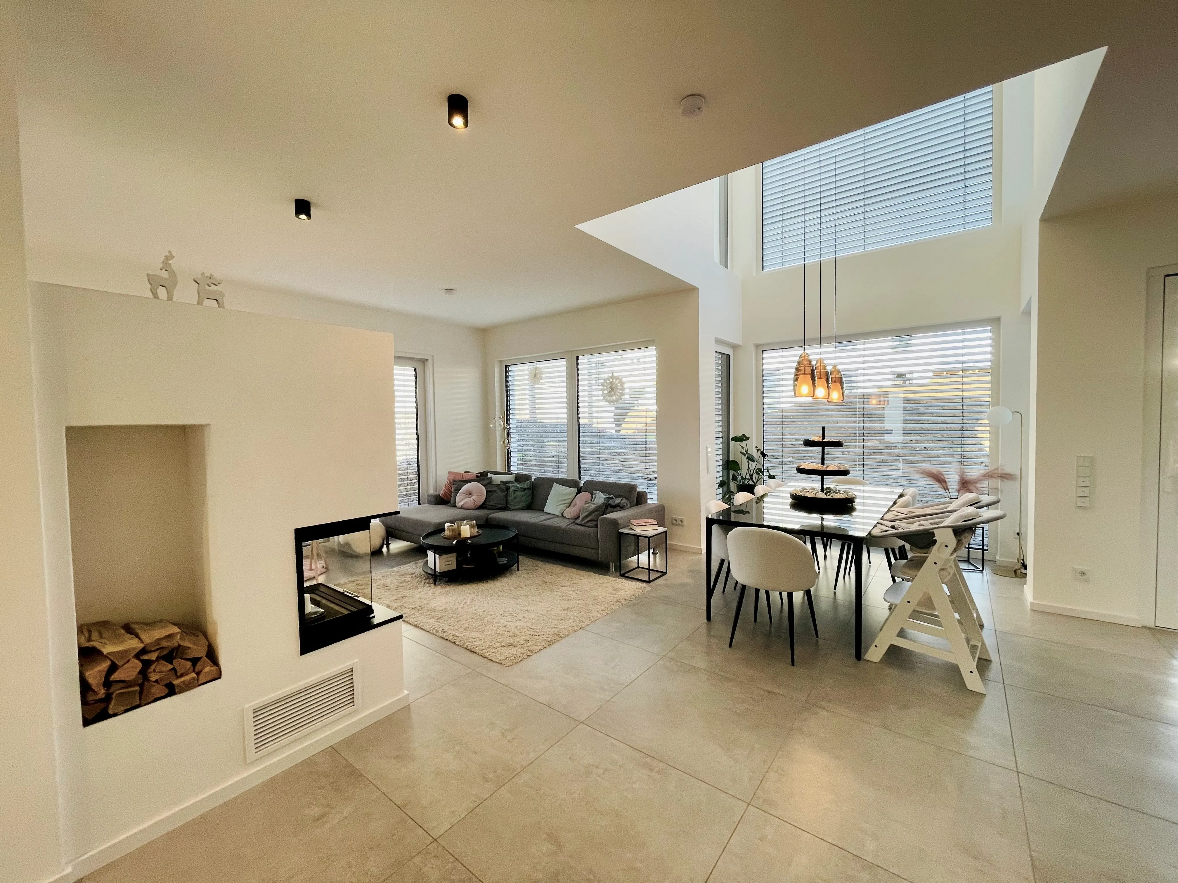 Ein schöner Mix aus modern & kantig, geerdetem Holz, warmen Grau und viel Weiß, was das Licht reflektiert. Im UG wurde eine Einliegerwohnung und ein Heim- Kino umgesetzt.