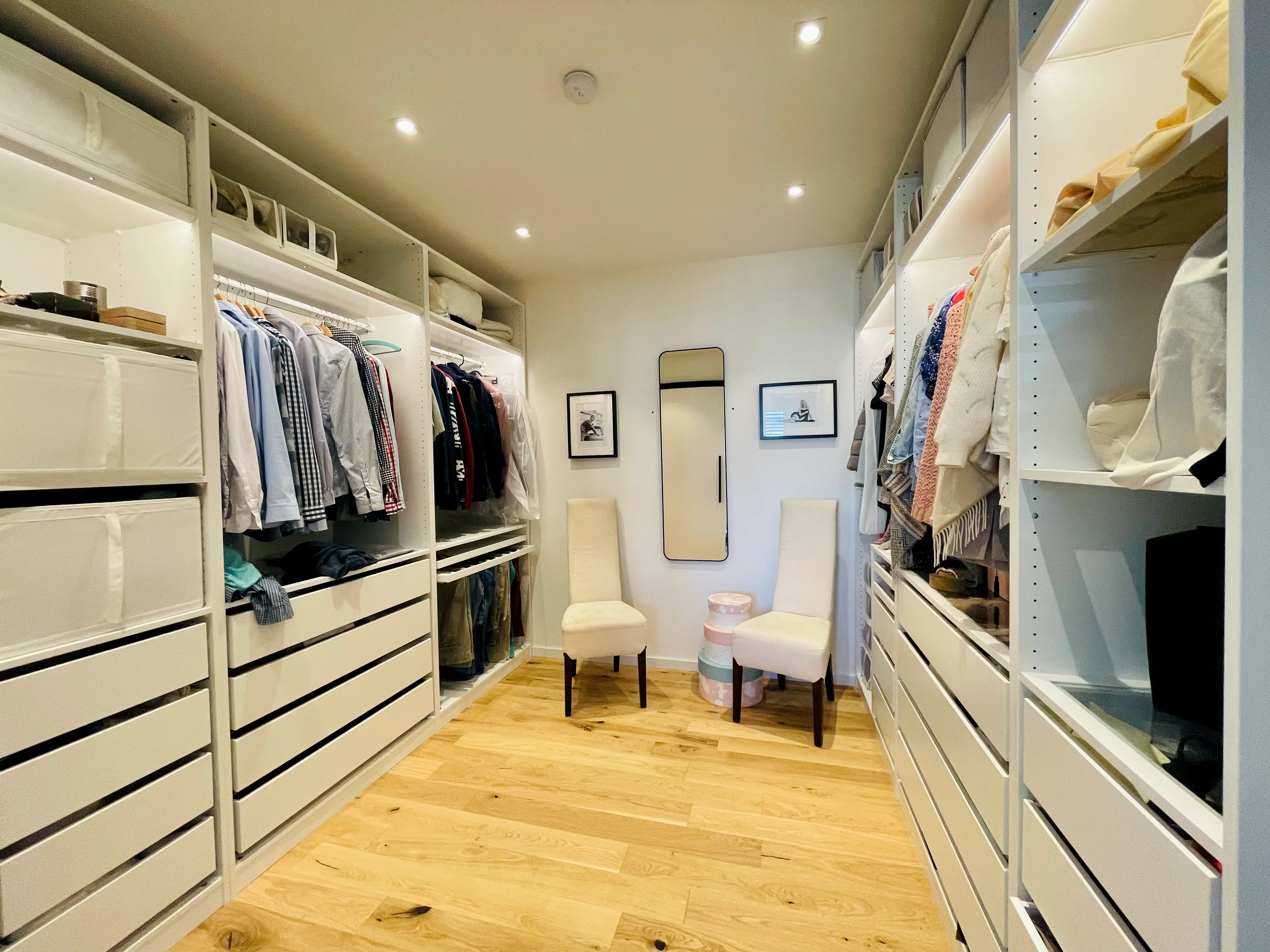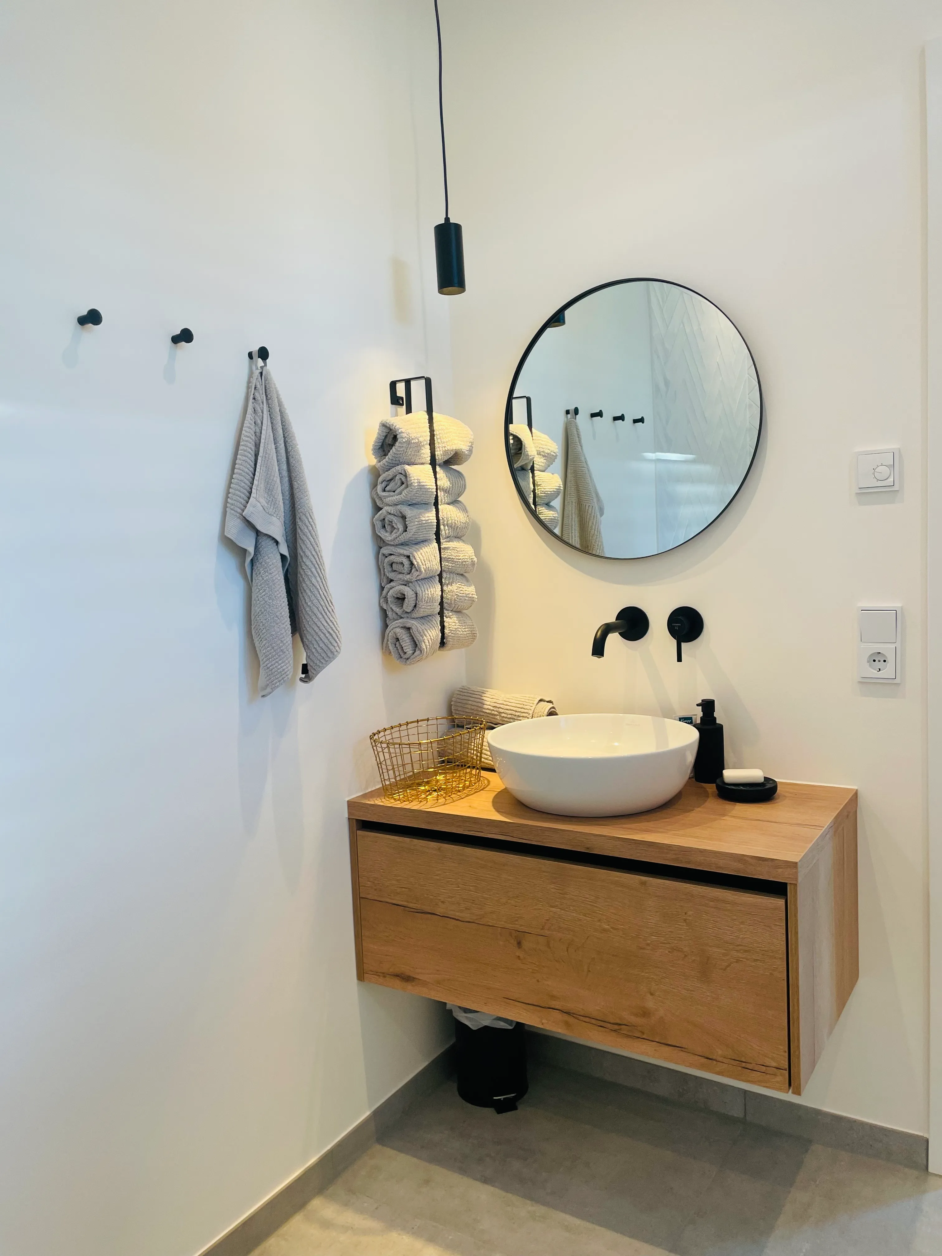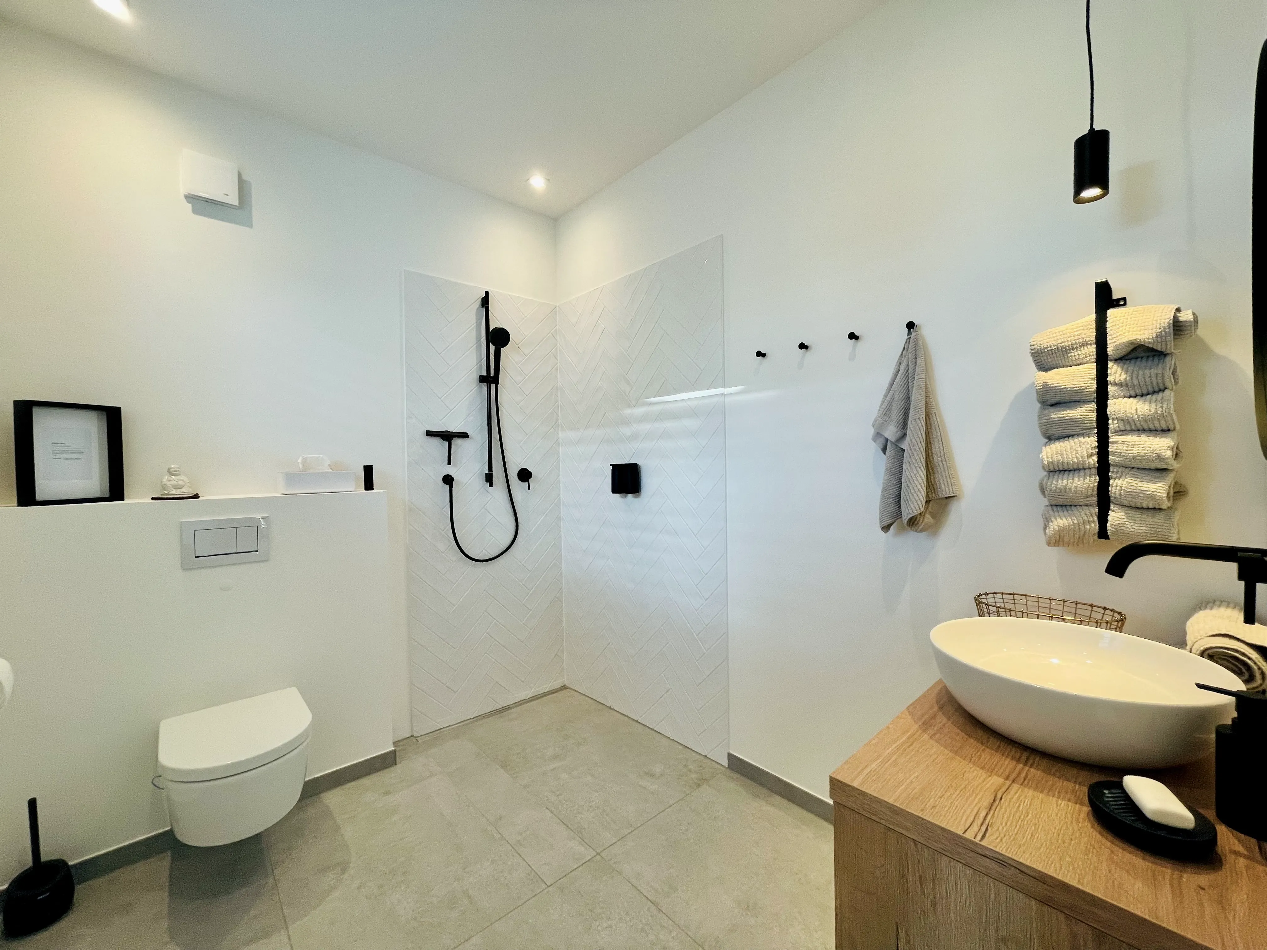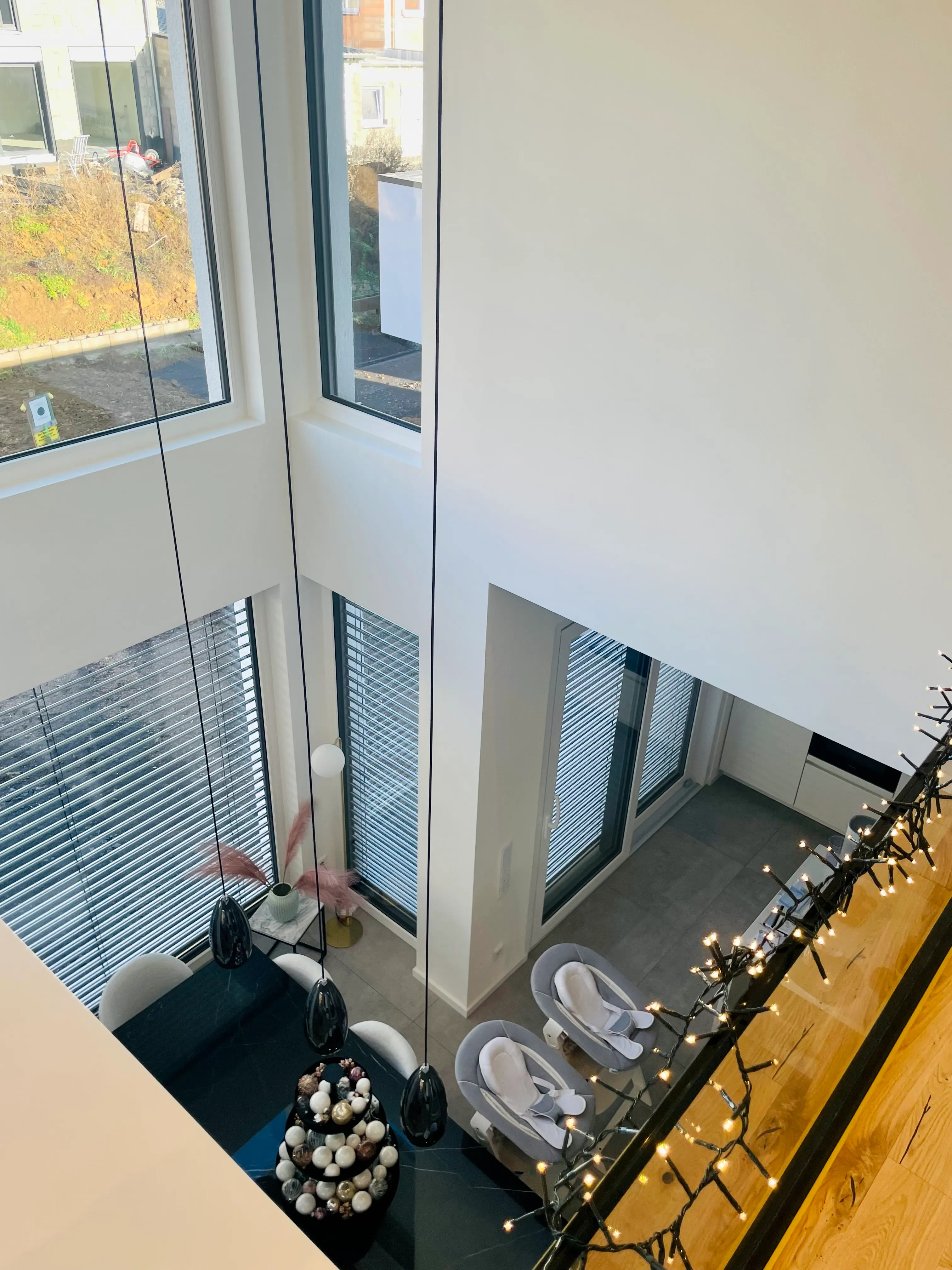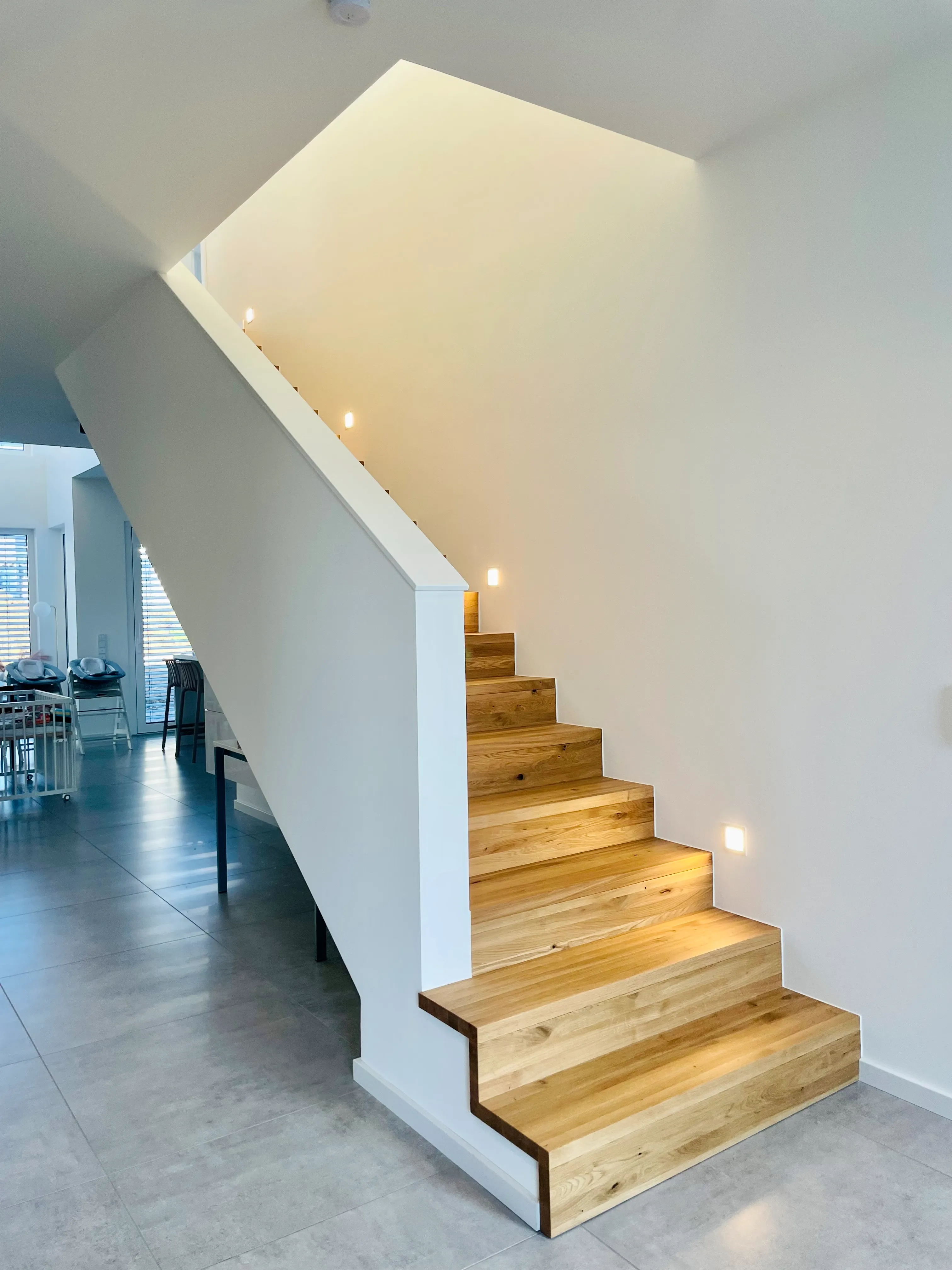 Ein schöner Mix aus modern & kantig, geerdetem Holz, warmen Grau und viel Weiß, was das Licht reflektiert. Im UG wurde eine Einliegerwohnung und ein Heim- Kino umgesetzt.